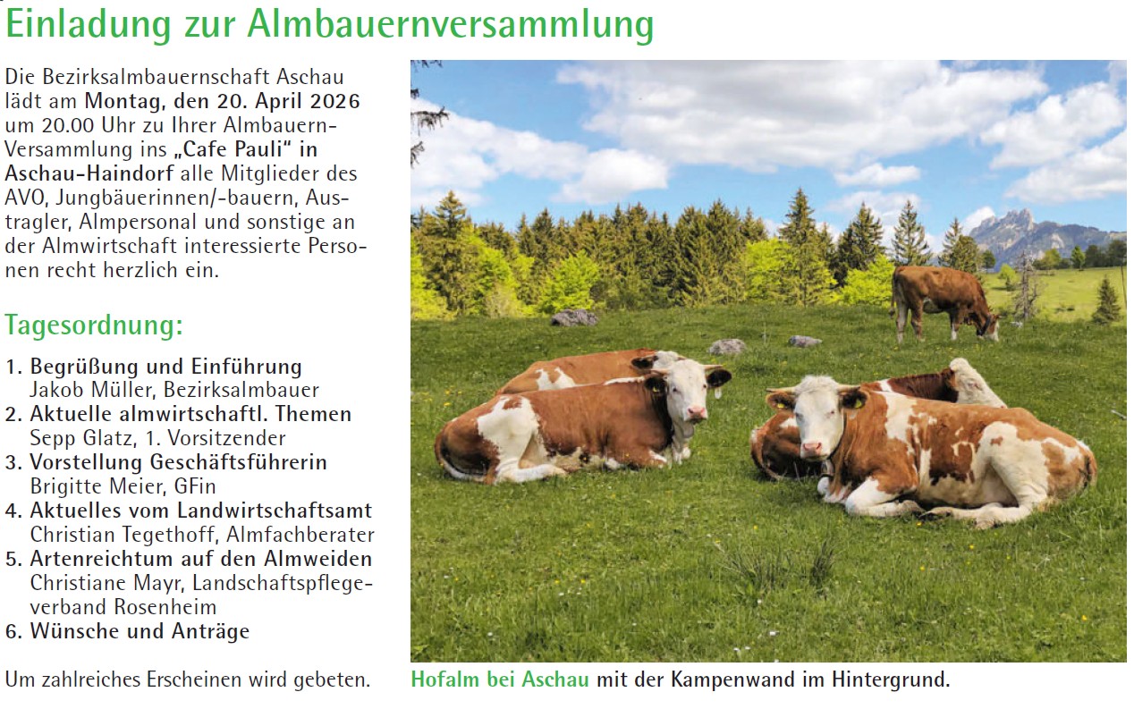 Mo., 20.04. Almbauernversamlung Aschau 20.00 „Cafe Pauli“ in Aschau-Haindorf