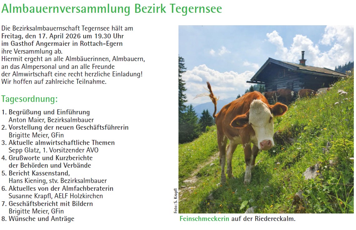 Fr., 17.04. Almbauernversammlung Tegernsee 19.30 Gasthof Angermaier in Rottach-Egern