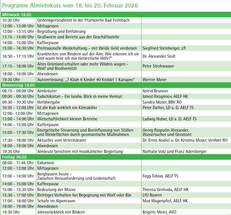 Heuer findet der traditionelle Almlehrkurs zum 66. mal vom Aschermittwoch, den 18. Februar 2026 bis zum Freitag, den 20. Februar 2026 beim Kistlerwirt in Bad Feilnbach  statt.