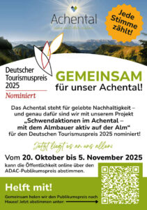 Das Projekt „Schwendaktion im Achental – mit dem Almbauer aktiv auf der Alm“ steht im Finale des Deutschen Tourismuspreises 2025 – und zählt damit zu den Top 5 Tourismusprojekten Deutschlands!